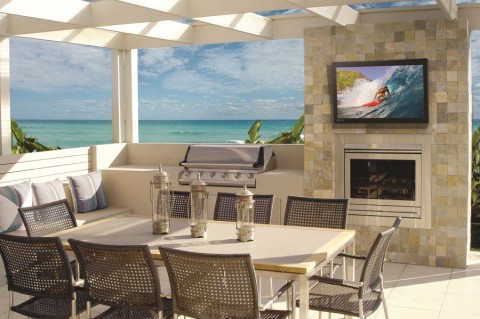 Why not add some visual stimulation to your outdoor experience? An outdoor TV from Samsung or Séura allows you to watch movies, live games, and TV programs in partial sun or full sun. Both companies design and manufacture state-of-the-art TVs that offer ultra-bright displays for extraordinary outdoor viewing. Put a TV by your pool deck, under your patio, in full sun in your outdoor kitchen, and anywhere else on your property. These smart TVs withstand heat, cold, rain, snow, and all outdoor environments. Just like your audio system, you can control them easily with your Crestron Home tablet.